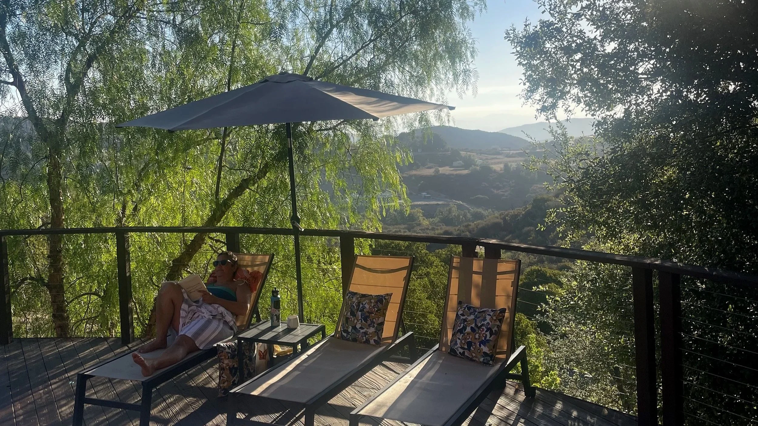 Image of a Deep Rest attendee resting and reading on a lounge chair amidst the diverse ecosystem of Santa Rosa Plateau, where Ojas Retreat Center is located.