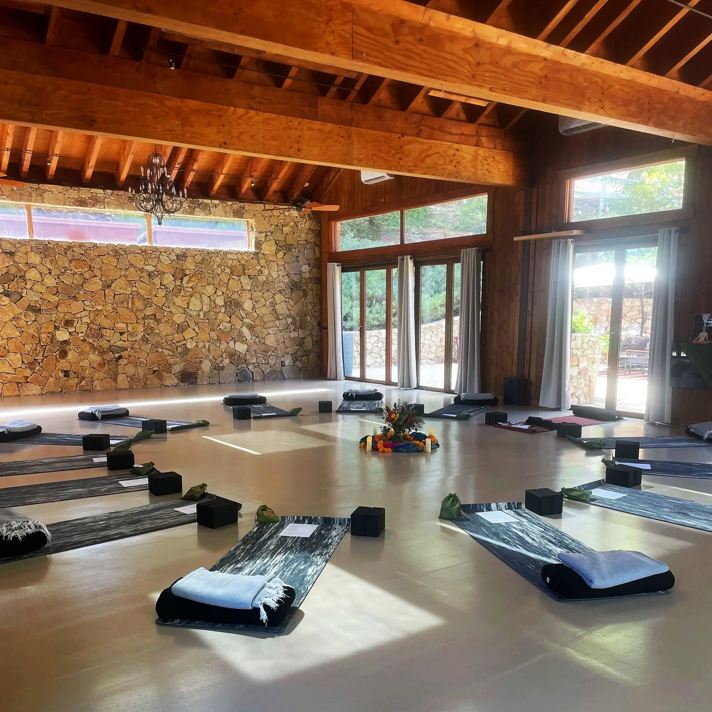 Image of a bright indoor yoga pavilion at Ojas Retreat Center with a circle of mat, props, and gift bags. The room has an angular wooden beam ceiling and floor to ceiling windows.